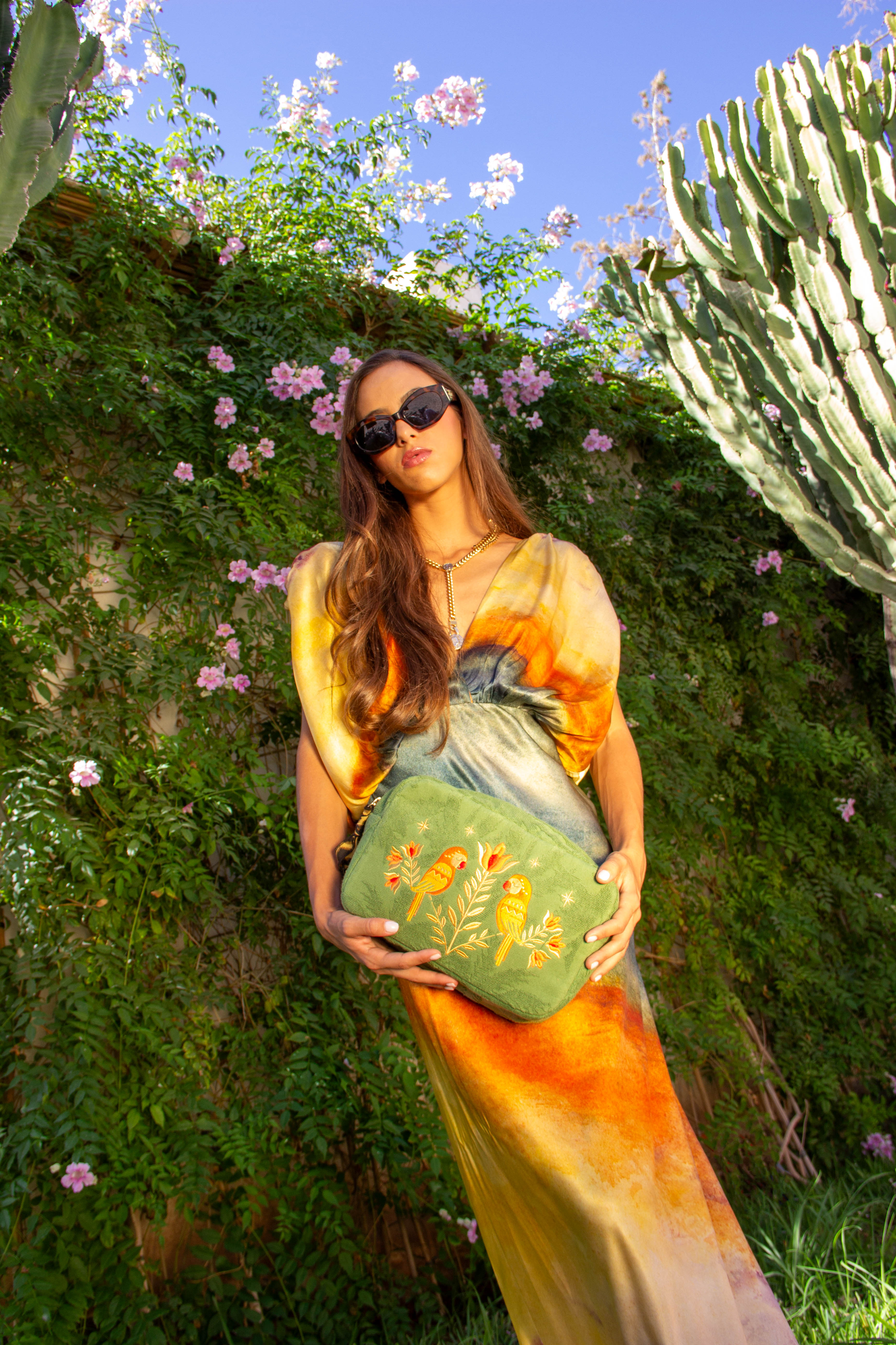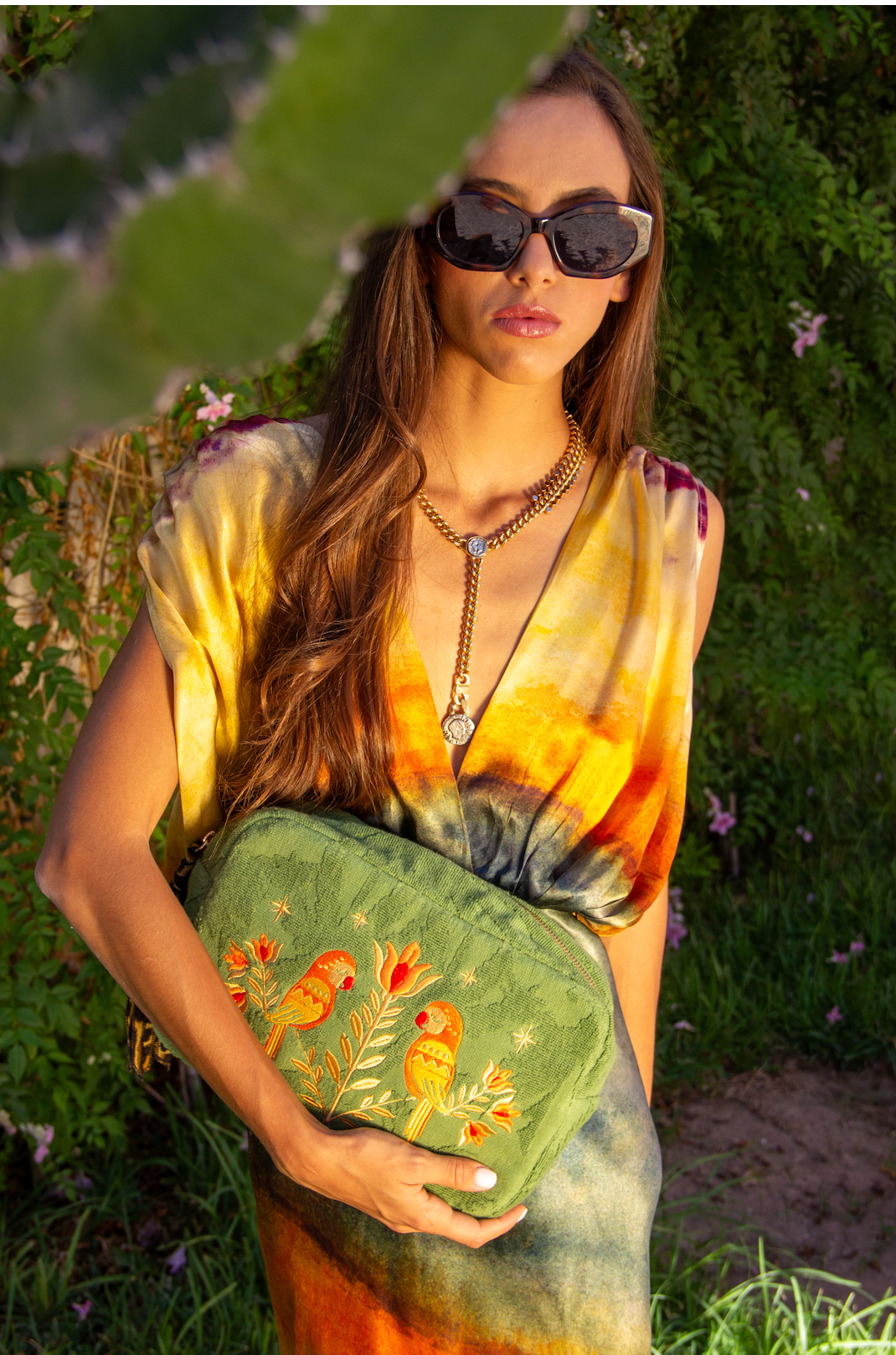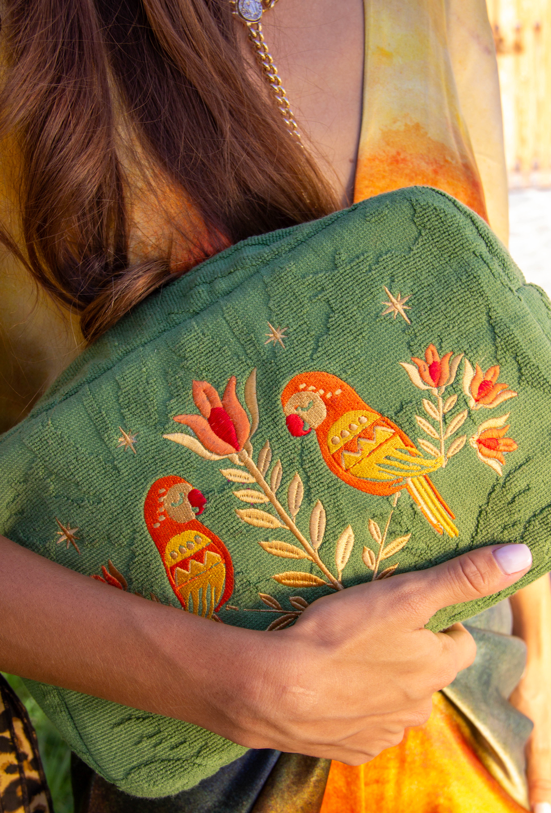 Coco Call évoque l’énergie vibrante des nuits tropicales, avec deux oiseaux exotiques brodés de tons vifs sur une éponge vert profond. À la fois pratique et élégante, elle s’utilise comme trousse de toilette, pochette de plage ou organisateur de sac. Une pièce qui allie fonctionnalité, couleur et esprit d’évasion insulaire.