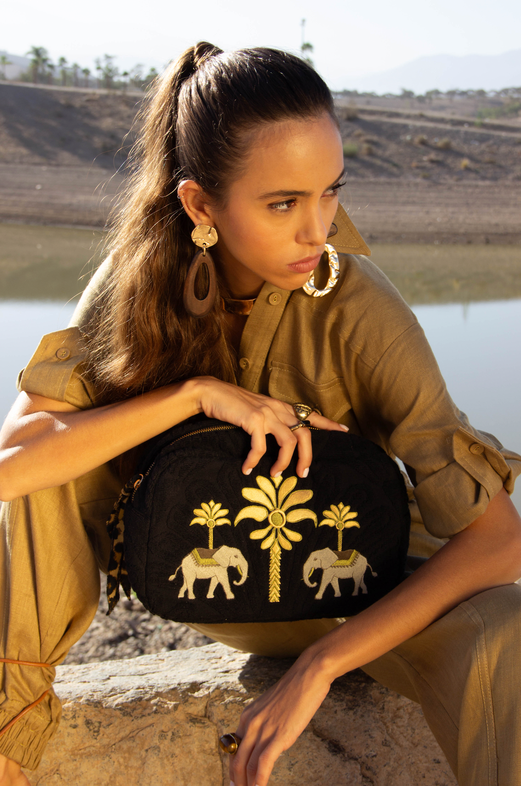 Elephant Spirit évoque la savane dorée, où deux éléphants majestueux se tiennent sous un palmier rayonnant. Brodée sur une éponge noire profonde, elle capture le charme des terres lointaines et la beauté sauvage. À la fois élégante et fonctionnelle, elle s’utilise comme trousse de toilette, pochette de plage ou organisateur de sac, unissant praticité et esprit d’aventure dans une pièce raffinée.