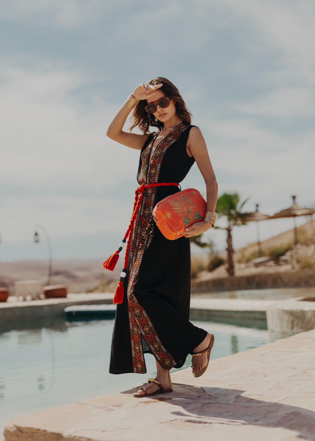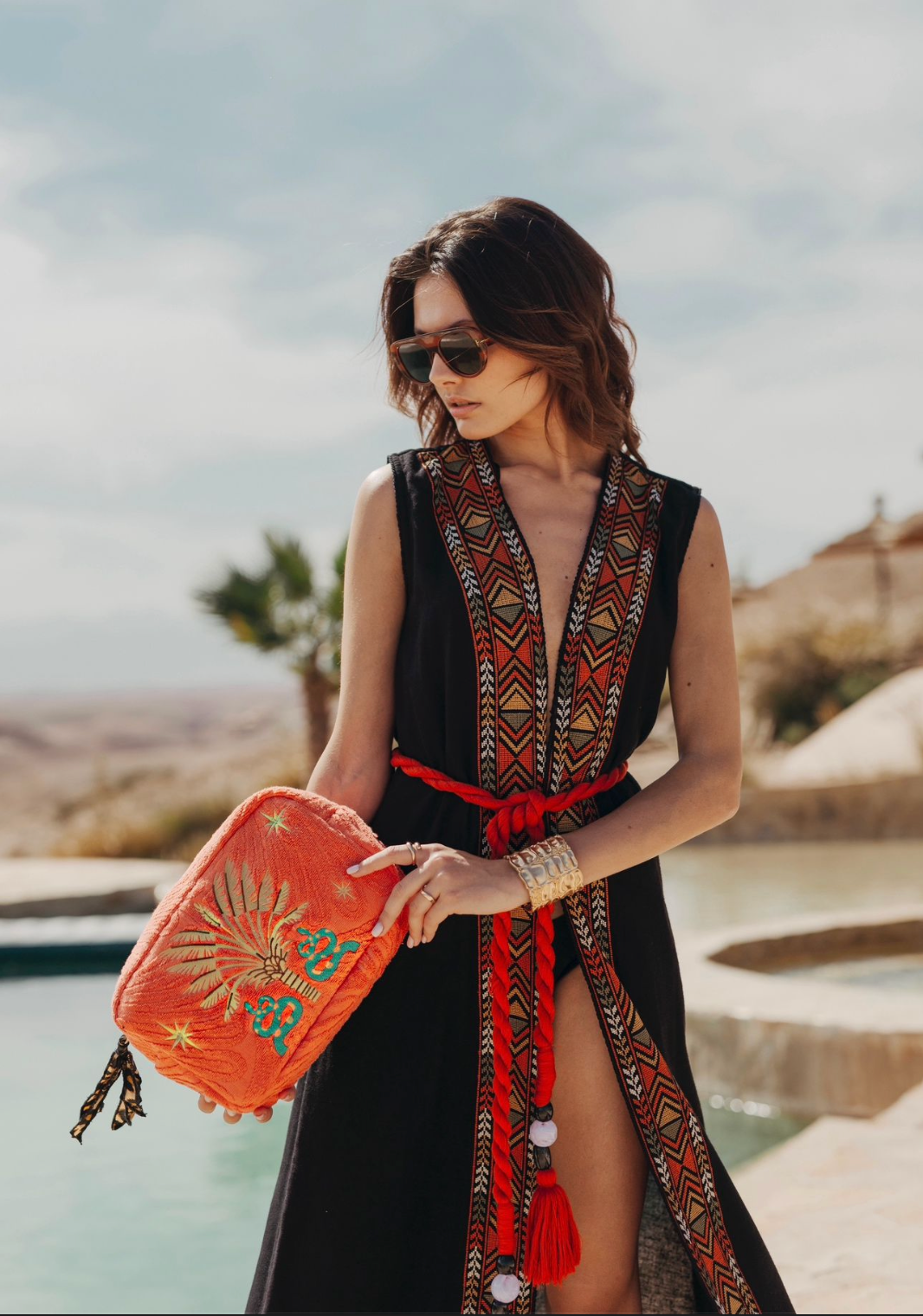Ornée de broderies délicates représentant des palmiers, des serpents et des étoiles, cette pochette combine l'artisanat traditionnel avec un design moderne et sophistiqué.