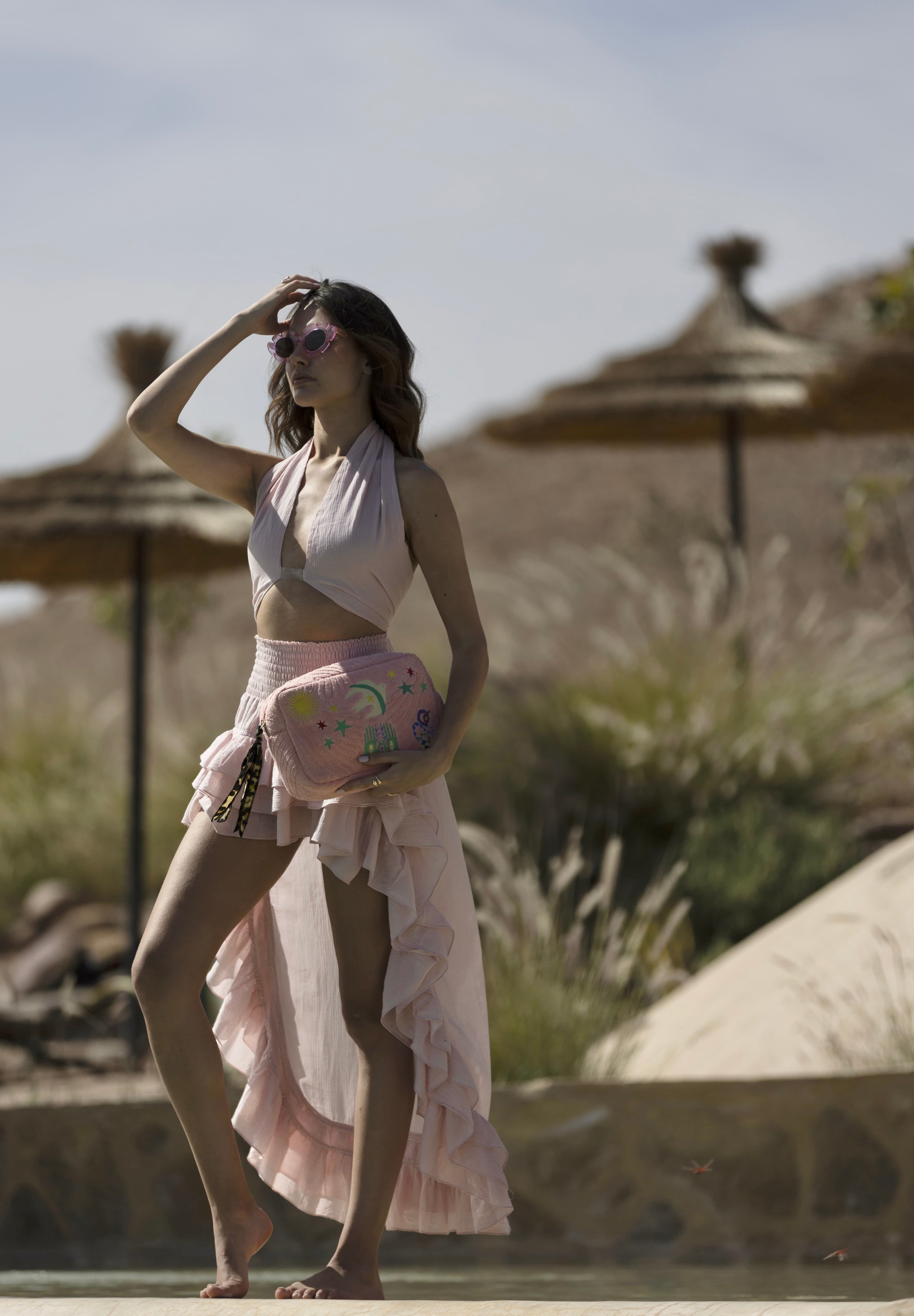 Découvrez un artisanat exceptionnel avec notre élégante pochette de plage en éponge rose, minutieusement brodée de motifs évocateurs tels qu’un oiseau majestueux, un soleil radieux, une main protectrice, une étoile scintillante et un serpent mystérieux. Chaque détail incarne l’essence de l'artisanat marocain, alliant tradition et modernité avec une touche d’exotisme. Fabriquée avec passion au Maroc, cette pochette devient votre compagne de voyage idéale pour des journées ensoleillées à la plage ou des promenades tranquilles le long de la côte.