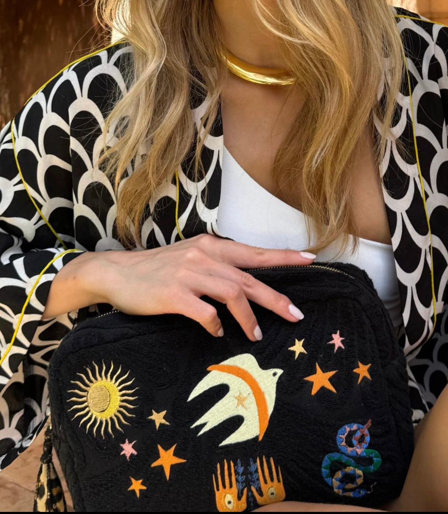 Les motifs brodés symbolisent la liberté et la grandeur de l'oiseau, la vitalité du soleil, la protection de la main, la guidance de l'étoile et le mystère du serpent. Cette pochette apporte une touche de modernité et de protection à vos aventures estivales.