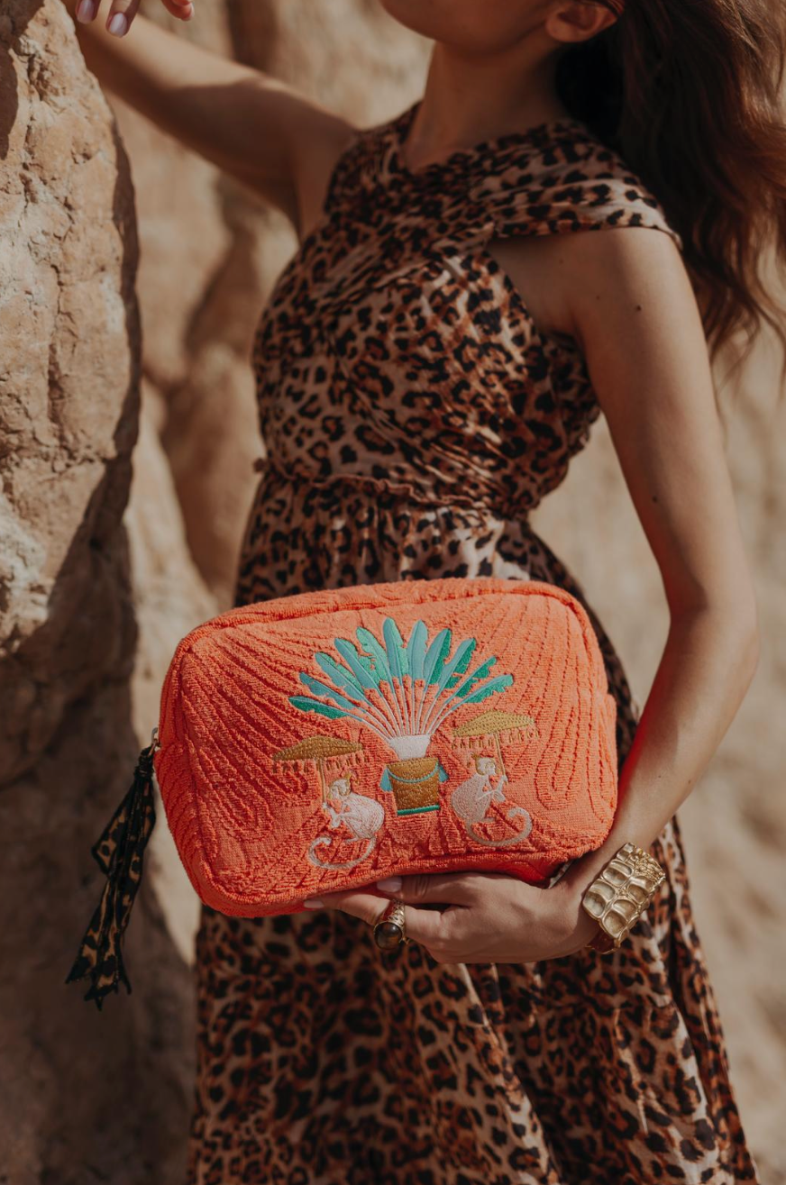 Cette pochette en éponge allie charme fantaisiste et style tropical.